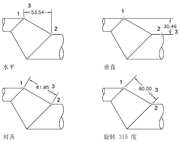 在四幅图中,分别将尺寸界线原点明确指定为 1 和 2。尺寸线位置指定为 3。