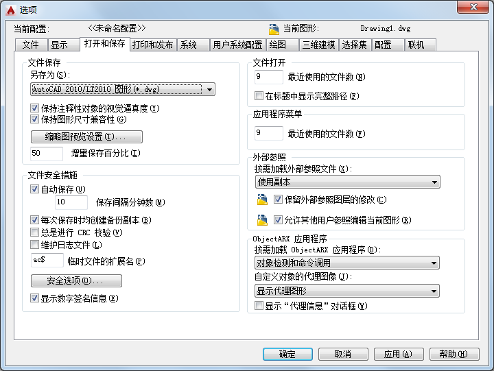 显示在使用 SAVE、SAVEAS、QSAVE 和 WBLOCK 命令保存文件时使用的有效文件格式。为此选项选定的文件格式将成为保存图形的默认格式。