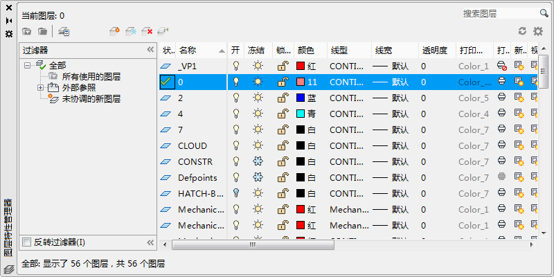 如果在“过滤器”窗格中选定了一个图层过滤器,则“图层列表”窗格将仅显示该图层过滤器中的图层。树状图中的“全部”过滤器将显示图形中的所有图层和图层过滤器。当选定某一个图层特性过滤器并且没有符合其定义的图层时,列表视图将为空。要修改选定过滤器中某一个选定图层或所有图层的特性,请单击该特性的图标。当图层过滤器中显示了混合图标或“多种”时,表明在过滤器的所有图层中,该特性互不相同。