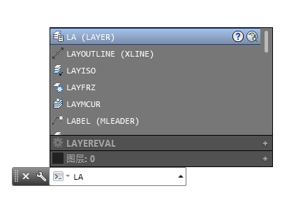如果禁用自动完成功能,则在命令行中键入一个字母并按 Tab 键以循环显示以该字母开头的所有命令和系统变量。按 Enter 键或空格键来启动命令或系统变量。