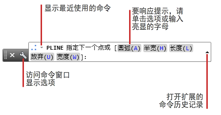 在您输入命令后,您可能会看到显示在命令行中的一系列提示。例如,输入 PLINE 并指定第一个提示后,将显示以下提示: