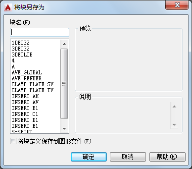 将块定义另存为图形文件。选择已存在的图形文件会覆盖保存的文件。默认情况下,指定的块名称将作为图形文件名。