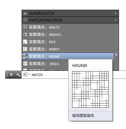 样例:假设您希望插入填充图案。在命令提示下输入 hatch 并按 Tab 键循环浏览选项时,将展开命令行建议列表以包括可用的填充图案。拖动滚动条以显示其他图案填充和渐变色。您可以通过将光标悬停在该名称上来查看每个选项的缩略图。