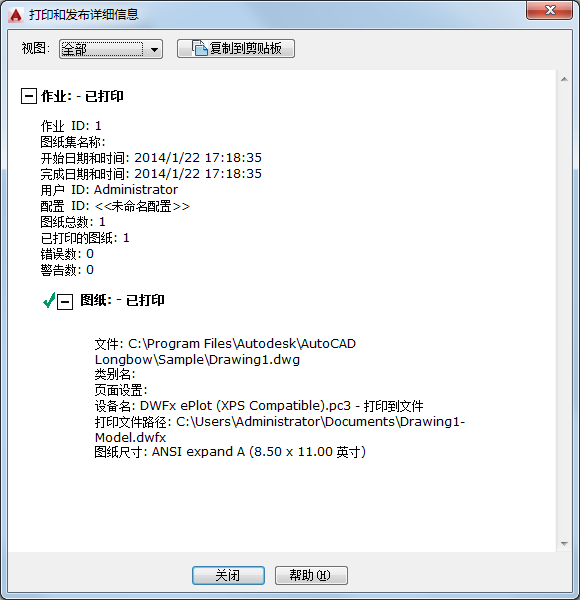 显示关于所有完成的打印和发布作业以及这些作业中的图纸的信息。