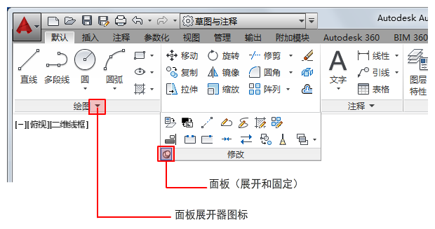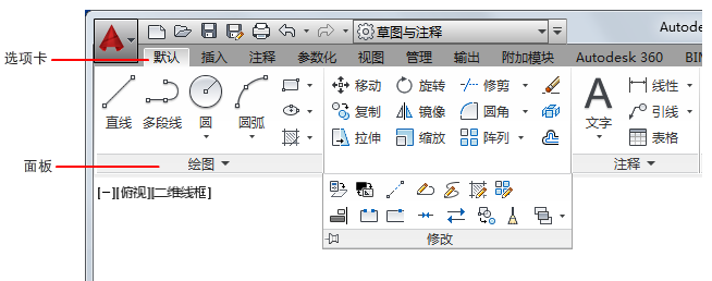 功能区由一系列选项卡组成,这些选项卡被组织到面板,其中包含很多工具栏中可用的工具和控件。