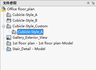 树状图的顶层始终显示当前图形。参照文件显示在下一层。可以打开包含其自身嵌套文件参照的参照文件以显示更深的层级。在树状图中进行选择时,一次只能选择一个文件参照。