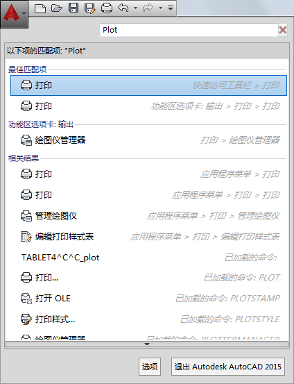 将在应用程序菜单的顶部显示“命令搜索”字段。搜索结果可以包括菜单命令、基本工具提示和命令提示文字字符串。可以输入任何语言的搜索词。结果将应用到当前的工作空间。