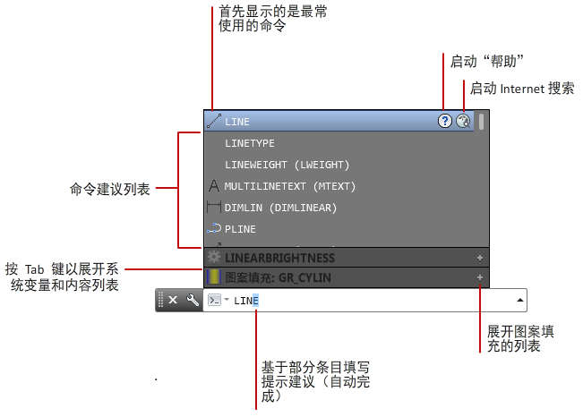 只要您在命令窗口或在动态输入框中输入命令的前几个字母,就会显示建议的命令列表。默认情况下,该列表包含以下特性: