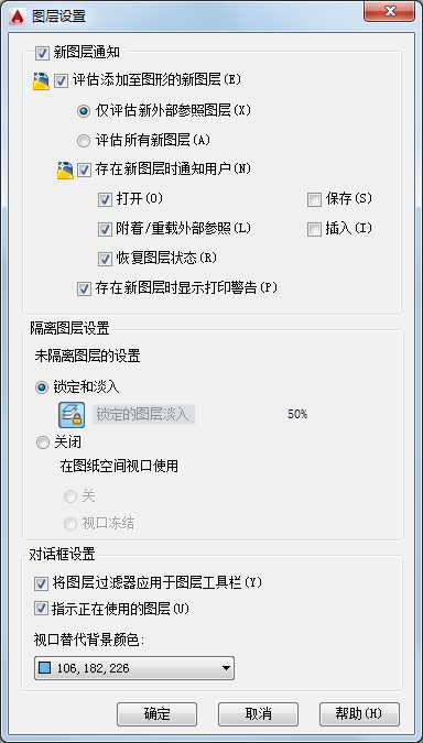 控制发出新图层通知的时间、在隔离某些图层时的图层行为、是否将图层过滤器应用到“图层”工具栏以及图层特性管理器中视口替代的背景色。
