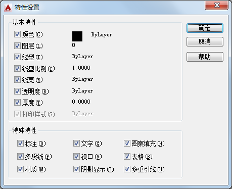 除基本的对象特性外,还将目标对象的图案填充特性(包括其注释性特性)更改为源对象的图案填充特性。要与图案填充原点相匹配,请使用 HATCH 或 HATCHEDIT 命令中的“继承特性”。此选项仅适用于图案填充对象。