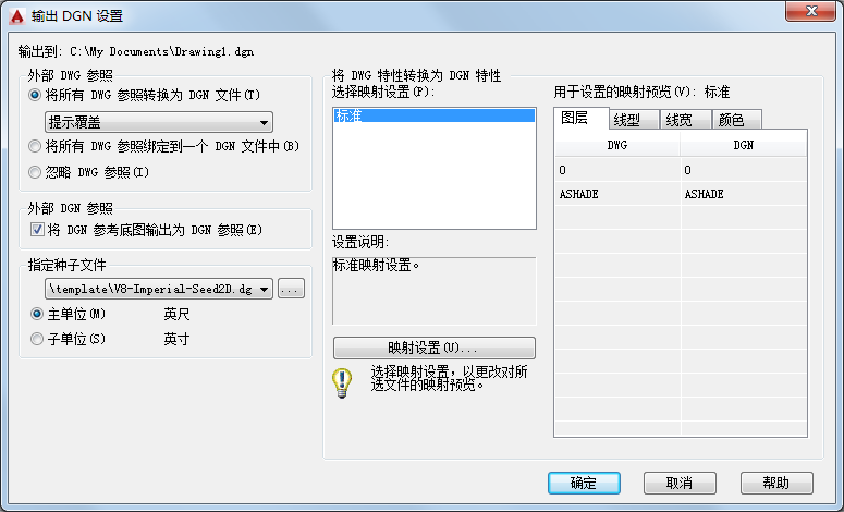 “标准”是默认的映射设置,使用该设置,可以从要输出的图形中提取数据并将自动映射应用到 DGN 图层、线型、线宽和颜色(如映射预览中所示)。