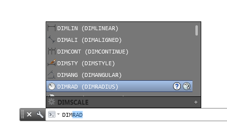在命令行开始键入命令或系统变量的名称时,自动完成功能会显示您的选择。例如,如果输入 dim,将列出所有以这些字母开头的命令和系统变量,如图所示。