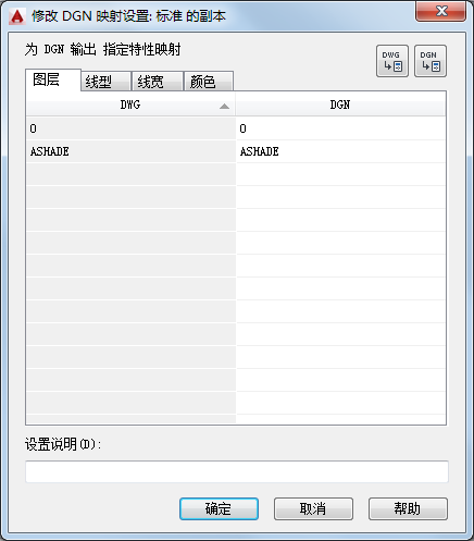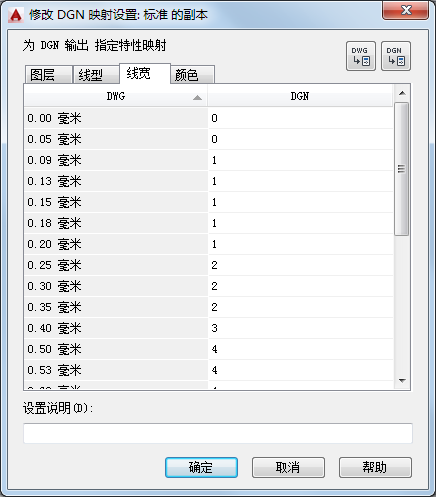 输出映射设置:如果已通过从“输出 DGN 设置”对话框创建新设置来访问“修改 DGN 映射设置”对话框,则 DWG 列将包括当前图形文件中所有已定义的线型。当目标单元(右侧列)为空时,我们将使用默认的系统映射。