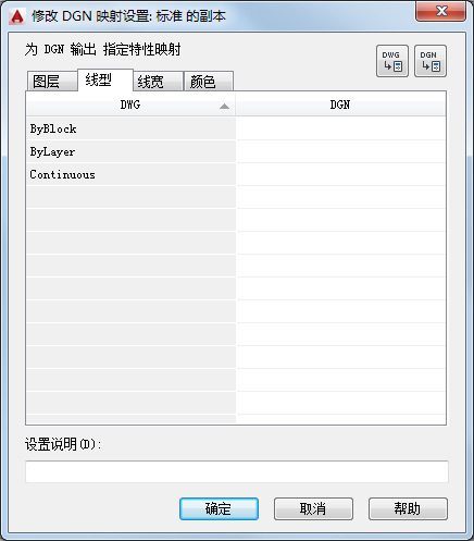 用户可以在右列的单元中直接键入 DGN 线型名称。如果将未知的线型名称添加到映射表的右列,将忽略这些线型并默认为“连续”。