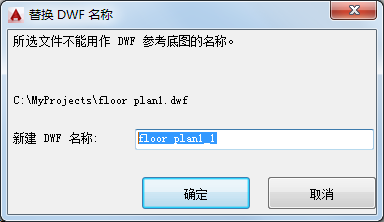 附着的 DWF 或 DWFx 参照的名称必须是唯一的。如果尝试附着两个具有相同名称的 DWF 或 DWFx 参照,将显示“替换 DWF 名称”对话框。