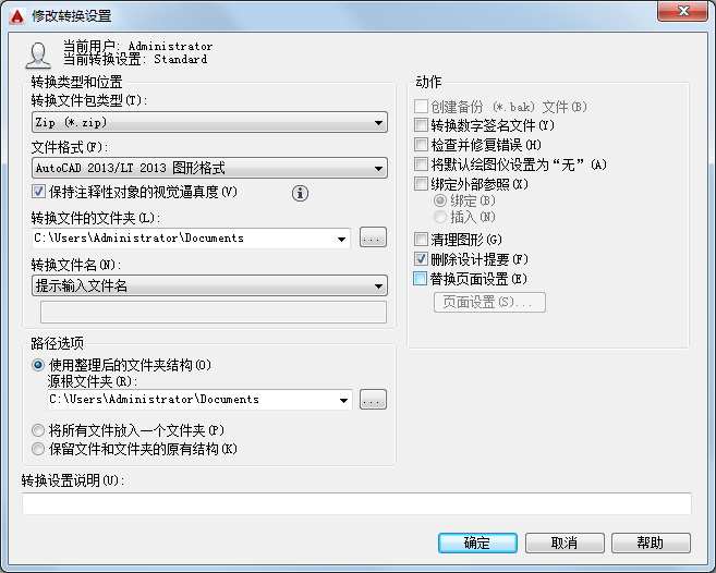 输入转换设置的说明。此说明将显示在转换文件设置列表下的“DWG 转换”对话框和“转换设置”对话框中。用户可以选择列表中的任何转换设置以显示其说明。