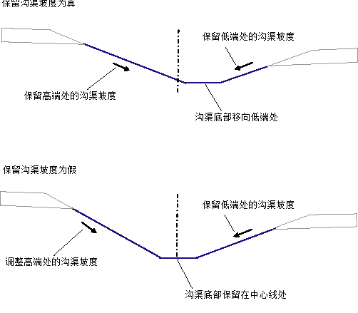 对于沟渠坡度顶部的点位于不等高程处的情况,请选择是保留沟渠边坡而移动沟渠位置,还是将沟渠保留在中心处而调整高侧上的边坡。 |