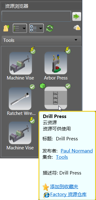- 资源发布到云后,即会显示在“资源浏览器”中供下载。通过用于基于云的资源的浏览器也可访问“Factory 资源仓库”。