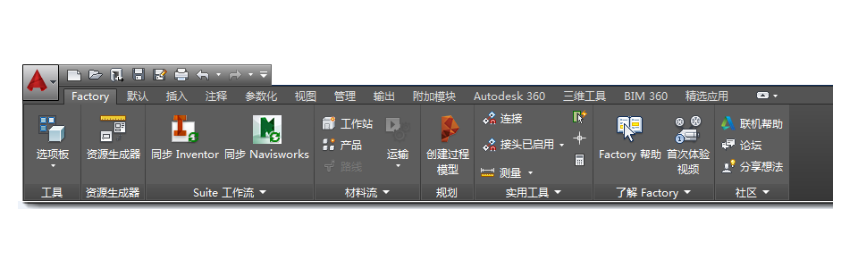 Factory Design Utilities 用户界面位于“Factory”选项卡上,包含名为“工具”、“资源生成器”、“Suite 工作流”、“材料流”、“规划”、“实用工具”、“了解 Factory”和“社区”的面板。Factory 与标准 AutoCAD 面板相结合,形成了默认的 Factory 工作环境。