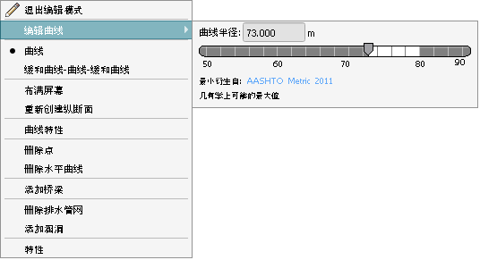 用户可以从一个值范围内选择半径的值,也可以拖动相切的曲线点或中点操纵器。更改设计道路上水平曲线的半径。