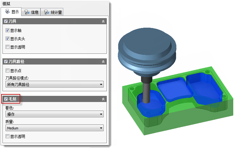 您可以启用“模拟”对话框中的“毛坯”复选框,以在模拟过程中查看当前刀具路径位置处的毛坯。该毛坯模拟使用非常快速并且具有全面多核心/CPU 支持的模拟引擎,从而让您可以在任何指定位置快速查看毛坯的外观。该引擎的速度非常之快,支持在新型的工作站上进行向后毛坯模拟。一般来说,您会看到有超过 100 Mb NC 代码的巨大 3D 程序在数秒钟内即可模拟完毕。该引擎专用于 3D 模拟,并且不支持掏槽和刀路加工。