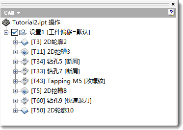 CAM 浏览器中设置和操作的顺序也是通常在最终 NC 程序中反映的顺序,或者模拟刀具路径时的顺序。刀具路径阵列化和刀具重排序是仅有的两项可影响所列顺序的功能。