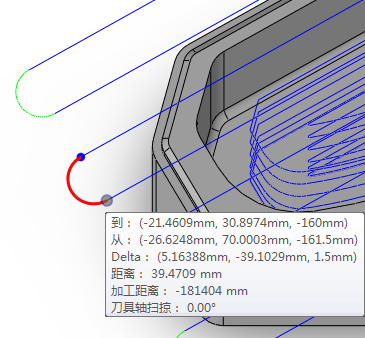 将鼠标移动到刀具路径上的任何其他点上。工具提示将会显示坐标、增量距离 (X,Y,Z)、空间距离和加工距离。