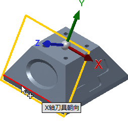 - 现在,需要指定 X 轴的方向。确保“X 轴刀具朝向”按钮处于激活状态,并选择如下图所示的零件的水平边: