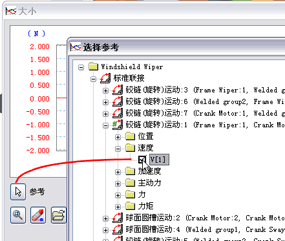 - 在“选择参考”对话框中,展开“标准运动类型”>“平移(Guide:1,Scottish Yoke:1)”来显示速度文件夹和内容。单击“V(1)”以指定速度为图形 X 轴的变量。