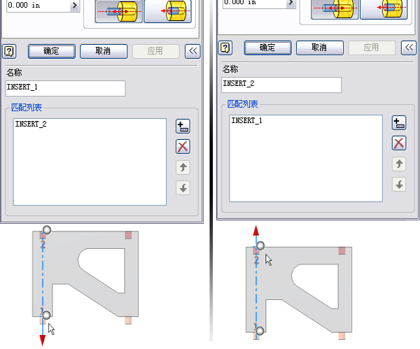 - 在孔 2 上创建名为 Insert_2 的 iMate 插入约束。展开对话框并创建首选的匹配 (Insert_1) 作为匹配列表中的第一个条目。