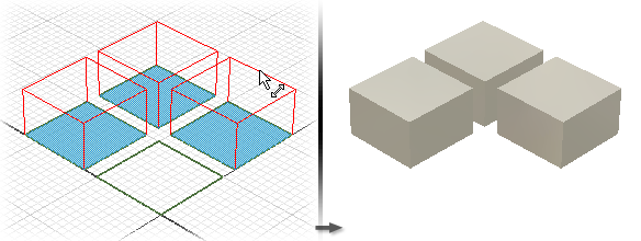 匹配形状 如果选择此选项,将创建填充类型的操作。截面轮廓的开口端将延伸到公共边或面。所需的面将缝合在一起,以形成与拉伸实体的完整相交。
