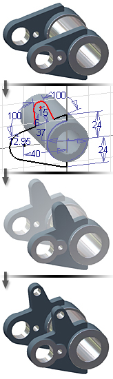 在下图中,轴一端的括号创建为另一个括号的镜像。被镜像的支架是参数化的。因此,它可以反映对父拉伸所做的更改。