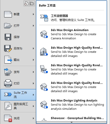 工作流在 3ds Max Design 或 Showcase 中将预先选定的设置应用到来自源产品(AutoCAD、Inventor 或 Revit)的设计数据。每个源产品提供了不同的工作流,而且可优化工作流以用于特定目的,例如高质量渲染或光源分析。