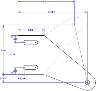 已在图形窗口中选择了几何图元,并在“拉伸”对话框中选择了基准点。该几何图元将拉伸到其新位置。将放宽所有必要的尺寸。原始尺寸将正常显示,新尺寸将显示在圆括号中。仅更改了两个尺寸。点线标识了几何图元的原始位置。