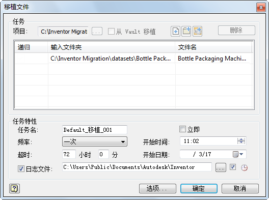 任务调度器会生成日志文件以记录成功移植和未成功移植的文件。该文件采用 ASCII 格式 (.txt),默认存储位置为 C:\My Documents\Inventor <版本>\Task Scheduler\Log & Report Files 或 C:\Users\Public\Documents\Autodesk\Inventor <版本>\Task Scheduler Logs & Reports。