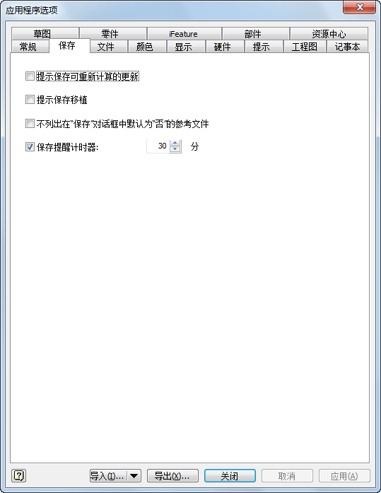 在“应用程序选项”的“保存”选项卡中,可以设置选项,以便在您打开然后关闭早期版本的 Inventor 文件时提示您进行保存和移植。