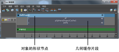 选定对象的所有几何缓存节点都将作为缓存片段加载到“Trax 编辑器”(Trax Editor)中。每个片段都放置在它自己的轨迹上,并且对象的所有缓存片段都在对象的形状节点下进行分组。