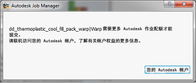 例如,如果您向云发送了分析序列(例如冷却+填充+保压+翘曲),而您的帐户中仅剩下两 (2) 个作业,则前两个分析将会成功运行,而第三个(翘曲)分析则会失败,并且您会收到类似下述内容的消息。