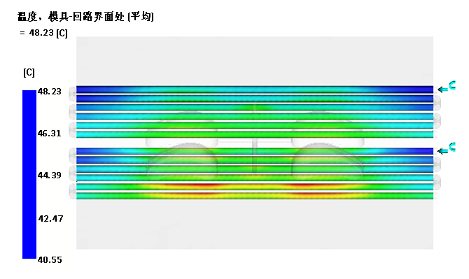 此结果最好不要比冷却液入口温度高出 5°C。型芯中有些位置会大于此理想值。