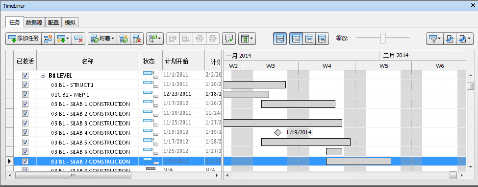 从数据源(例如 Microsoft Project™)导入时,Autodesk Navisworks “TimeLiner”支持分层任务结构(有关详细信息,请参见“数据源”选项卡)。分别单击任务左侧的加号或减号可以展开或收拢层次结构。