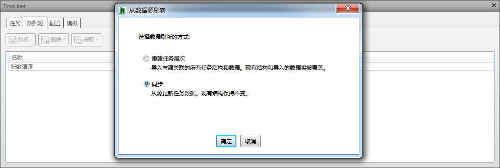 可以使用 “数据源”选项卡 导入外部源(例如 Microsoft Project™)中的任务。可以选择外部进度中的某个字段来定义导入任务的类型,也可以手动设置任务类型。可以直接在“TimeLiner”中编辑任务参数。也可以从外部更新明细表,然后“刷新”“TimeLiner”中的任务,使其与外部源一致。下次刷新外部项目文件时,对从相应的数据源导入的任务所做的任何更改都将被覆盖。