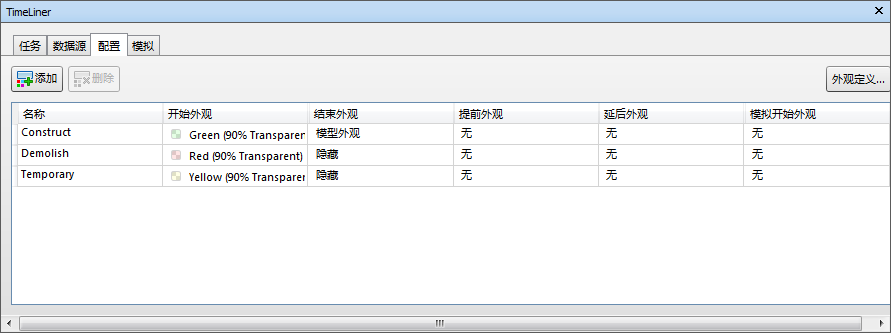 ,或者在“任务”区域中单击鼠标右键,然后基于图层、项目或选择集名称创建一个初始任务集。“TimeLiner”为您定义了一些默认任务类型(“建造”、“拆除”和“临时”),或者您可以在“配置”选项卡上定义自己的任务类型。还可以查看您的项目进度表的只读图形表示,并能在“计划”、“实际”和“计划与实际”甘特图之间进行切换。