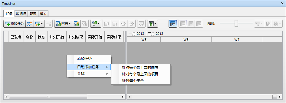 如果您使用“任务”选项卡上的自动添加任务功能基于图层、项目或选择集名称创建了一个初始任务集,则已经为您附着了相应的图层、项目或选择集。