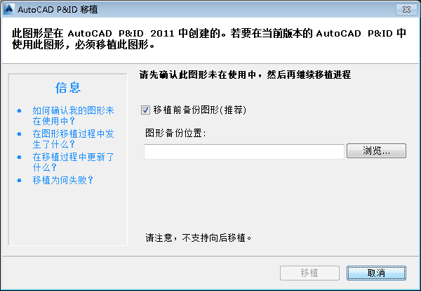 建议备份图形,以防需要在 AutoCAD P&ID 2011 中进一步处理。