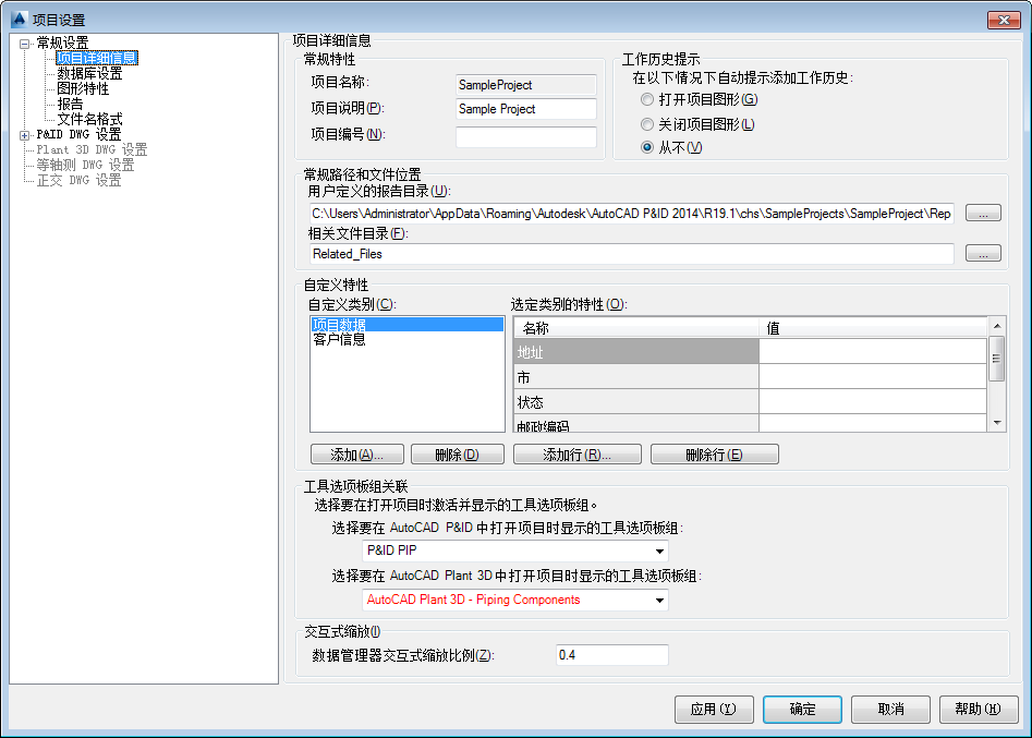 “项目设置”对话框的左侧显示树结构,由称为树节点的项填充而成。选择一个树节点时,会在右侧显示节点特定内容,可在此对项目设置进行更改或添加。