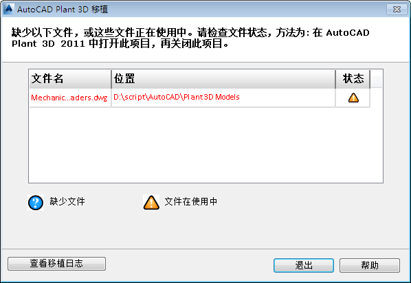 为了成功移植项目,AutoCAD P&ID 必须能够以独占模式锁定与项目相关的所有文件。如果与项目相关的文件缺失或文件当前正被使用,则会显示“文件不可用”页。例如,移动了图形或从项目文件夹中删除了文件,或者有人正使用 AutoCAD P&ID 2009 编辑图形。