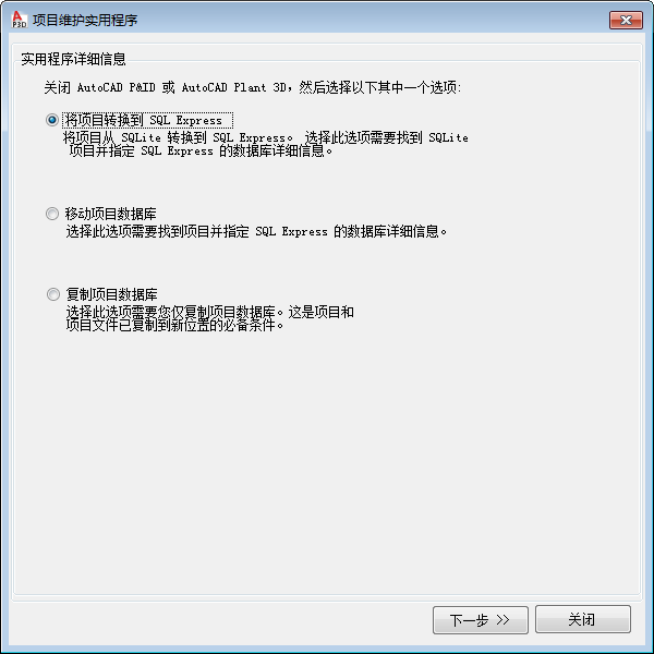 在项目目录中创建 SQLite 文件 (*.dcf.bak) 的备份。通过删除 .bak 可以重命名文件,以恢复为默认 (SQLite) 格式。这必须在对项目图形进行任何修改之前完成。
