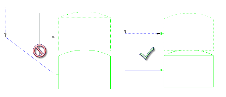 如您所预期,在 P&ID 图形中,使用 STRETCH 命令并选择草图线和储罐的一部分将拉伸线、移动储罐和附着管嘴。在此处的图形中,左视图显示了如果对普通 AutoCAD 线使用 STRETCH 将出现的情况:线将从储罐中拆离。右视图显示了拉伸草图线、移动储罐和保持管嘴附着的情况。虚线表示在完成该命令之前,移动光标时可能出现的结果的实时预览。