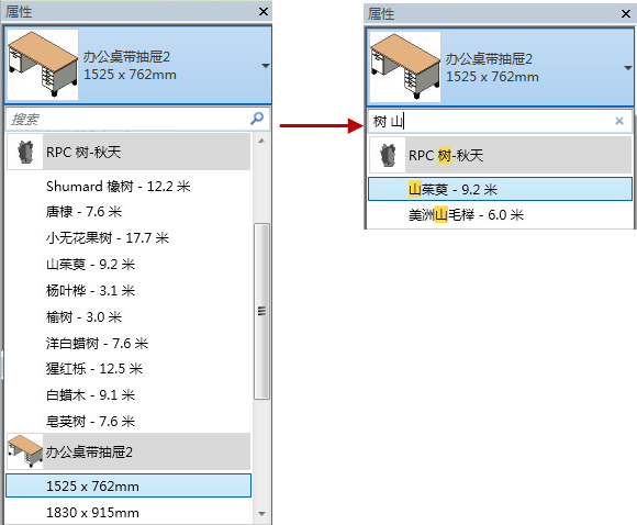 Revit,以使其更易于从长选项列表中进行选择。 您可以在以下功能区域进行搜索: