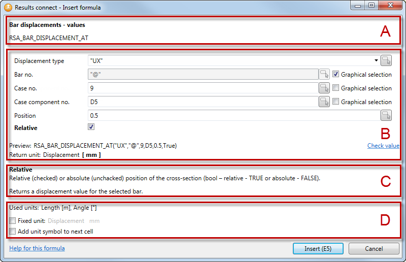The Insert formula dialog (corresponding to the selection made) contains the following sections:
